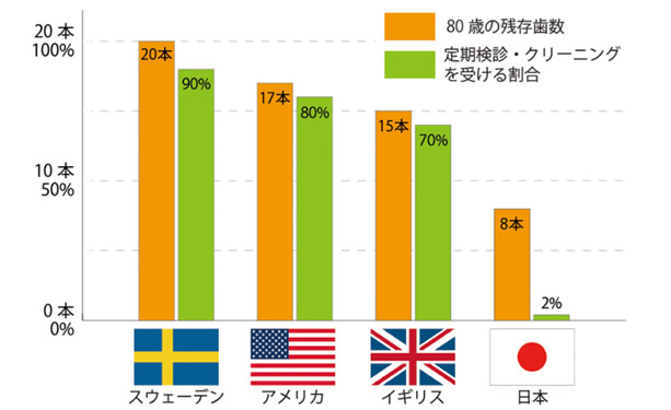 これは、歯科医院で「歯のメンテナンス」を定期的に受けている割合と、80歳になった際の「残存している歯の数」を国別で比較したものです。