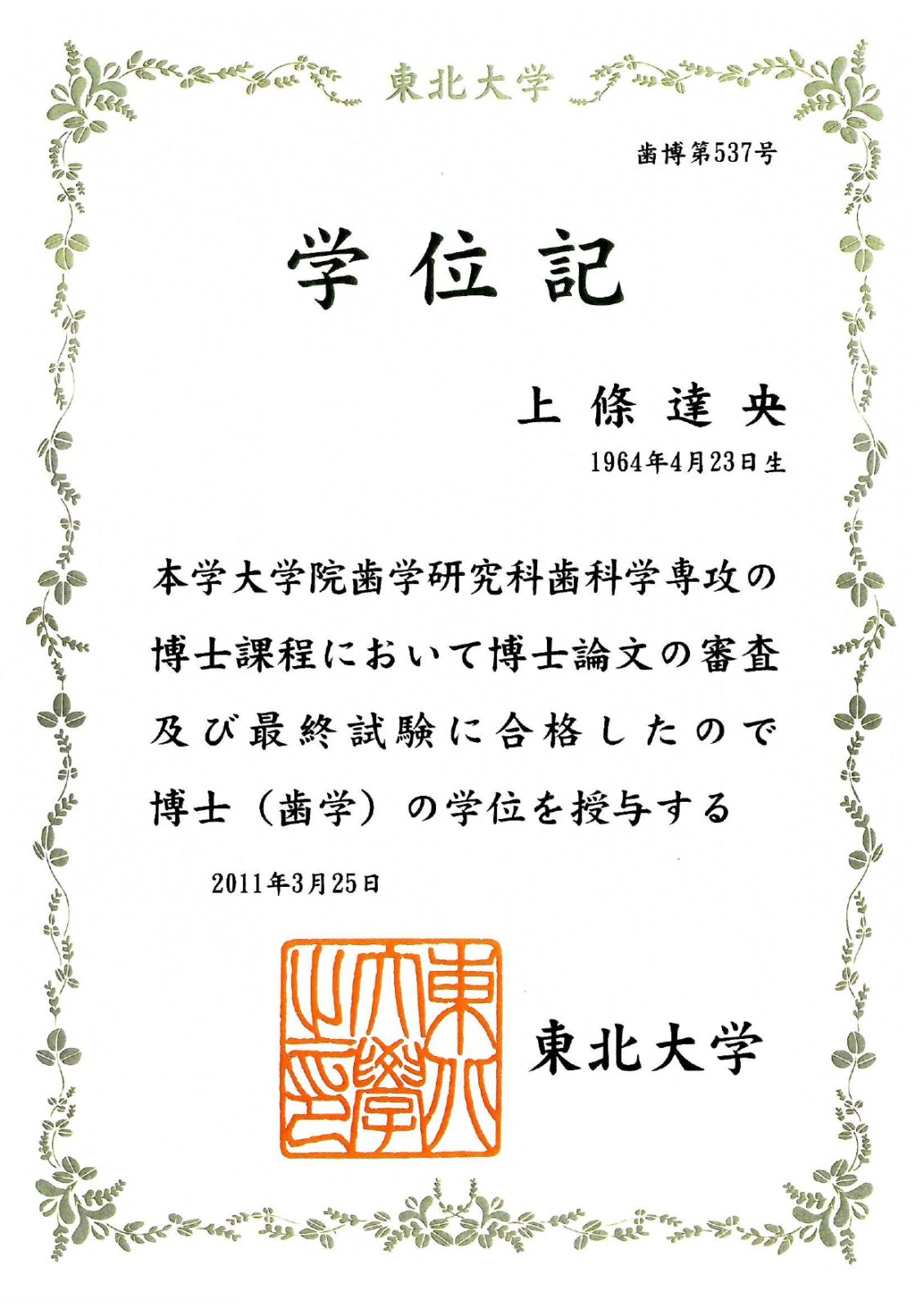 | 東北大学歯学部 卒業 |
